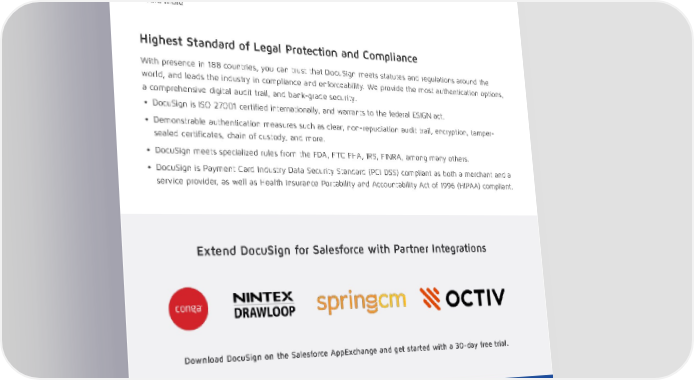 DocuSign for Salesforce FACT SHEET Administrative Features • Admin dashboard allows easy deployment across your organization • Create custom buttons • Customize with recipes • And more Highest Standard of Legal Protection and Compliance With presence in 188 countries, you can trust that DocuSign meets statutes and regulations around the world, and leads the industry in compliance and enforceability. We provide the most authentication options, a comprehensive digital audit trail, and bank-grade security. • DocuSign is ISO 27001 certified internationally, and warrants to the federal ESIGN act. • Demonstrable authentication measures such as clear, non-repudiation audit trail, encryption, tamper- sealed certificates, chain of custody, and more. • DocuSign meets specialized rules from the FDA, FTC FHA, IRS, FINRA, among many others. • DocuSign is Payment Card Industry Data Security Standard (PCI DSS) compliant as both a merchant and a service provider, as well as Health Insurance Portability and Accountability Act of 1996 (HIPAA) compliant. Extend DocuSign for Salesforce with Partner Integrations Download DocuSign on the Salesforce AppExchange and get started with a 30-day free trial. About DocuSign DocuSign® is changing how business gets done by empowering more than 225,000 companies and 85 million users in 188 countries to sign, send and manage documents anytime, anywhere, on any device, with confidence. DocuSign replaces printing, faxing, scanning and overnighting documents with the easiest, fastest, most trusted way to make every approval and decision digital. Organizations of all sizes and industries are accelerating contracts, approvals and workflows with DocuSign’s Digital Transaction Follow Us: Management (DTM) platform and eSignature solution. DocuSign keeps life and business moving forward. DocuSign® is changing how business gets done by empowering more than 225,000 companies and more than 85 million users in 188 countries to sign, send and manage documents anytime, anywhere, on any device with confidence. DocuSign replaces printing, faxing, scanning and overnighting documents with the easiest, fastest, most trusted way to make every approval and decision digital. Organizations of all sizes and industries are accelerating contracts, approvals and workflows with DocuSign’s Digital Transaction Management (DTM) platform and eSignature solution. DocuSign keeps life and business moving forward.
